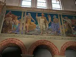 1920 hatte der Aachener Künstler Hermann Krahforst den Auftrag erhalten, die Kirche auszumalen. Neben der Ausmalung der Kuppel und des Chorraumes schuf er mit seinen Mitarbeitern auch die sechs großen Fresken. Sie zeigen Szenen aus dem Leben Jesu.[24] Bei der Renovierungsmaßnahme der Kirche 1954 bis 1956 wurden das Kircheninnere einschließlich der Kuppel weiß überstrichen und die Wandbilder mit weißen Leintüchern verdeckt; 1968 wurden sie weiß übermalt.