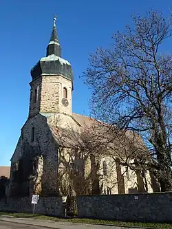 Die Kirche ist ein einschiffiger Bruchsteinbau mit quadratischem (oben ins Achteck übergehenden) Westturm und eingezogenem Chor (5⁄8-Schluss) aus der Mitte des 15. Jahrhunderts. Der Turm wurde in der ersten Hälfte des 18. Jahrhunderts mit Zwiebelhaube und Laterne zum Teil neu gebaut. An Schiff und Chor finden sich Strebepfeiler, an der Chornordseite führt eine Wendeltreppe zur jüngeren Patronatsloge.[4]