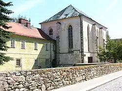 Die gotische Einstützenkirche von 60 Fuß Länge und 30 Fuß Breite mit stumpf abgewinkeltem Ostabschluss, von einer Familie von Asch gestiftet und von den Kreuzherren mit dem Roten Stern erbaut, grenzte ursprünglich direkt an den inneren Brucktorturm. Der Haupteingang, ein profiliertes Spitzbogenportal aus der Zeit um 1320 lag in der Mitte der Südwand (heute vermauert). Der heutige Eingang befindet sich im Westen von der Seite der Kommende, einem einstöckigen, schmucklosen Gebäude aus der Barockzeit, das direkt an die Kirche anschließt. Die St.-Wenzels-Kapelle, 1347 von Niklas Walther von Hof gestiftet, mit südlichem Anschluss an die St.-Bartholomäus-Kirche erbaut, wurde 1945 nach Beschädigungen abgerissen.