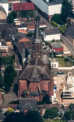 Der stark zerstörte neugotische Backsteinbau wurde von 1877 bis 1879 verändert wieder aufgebaut. Zur Ausstattung gehören die Figuren des Heiligen Johannes und der Maria aus Eiche von einer niederrheinischen Kreuzigungsgruppe aus der Zeit um 1500. Die Figuren sind nicht gefasst. Das Kruzifix ist wohl aus dem 16. Jahrhundert.