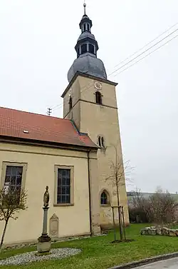 Das mit einem Satteldach bedeckte Langhaus der Saalkirche wurde von 1734 bis 1736 an den um 1300 errichtet Chorturm angebaut, der zu dieser Zeit um ein Geschoss, das die Turmuhr und den Glockenstuhl beherbergt, aufgestockt und mit einer gestuften Welschen Haube bedeckt wurde.
