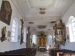 Die beiden Seitenaltäre entstanden zusammen mit dem Hauptaltar ebenfalls um 1734. In der Nische des linken Retabels befindet sich eine Figur des hl. Sebastian, im rechten Altaraufbau eine Figur des hl. Josef, außerdem die Eltern Marias Anna und Joachim. Die reich geschmückte Kanzel zeigt die vier lateinischen Kirchenväter und den Guten Hirten. Auf dem Schalldeckel befinden sich um einen Salvator Mundi Personifikationen der vier damals bekannten Erdteile. An den Kirchenwänden befinden sich Skulpturen der hll. Johannes Nepomuk, Michael, Johannes der Täufer, Leonhard und Florian sowie das Kanzelkreuz mit der Mater Dolorosa.