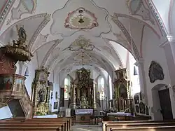 Das Langhaus hat fünf Joche, nach Osten schließt sich der leicht eingezogene, dreiseitig geschlossene Chor an. Der Innenraum des Langhauses ist mit einem Stichkappen-Tonnengewölbe überspannt. Südlich an den Chor angebaut ist die Sakristei mit einem Oratorium im Obergeschoss, nördlich der Chorflankenturm mit dem Glockenstuhl im obersten Geschoss und einem Satteldach zwischen quer angeordneten Staffelgiebeln mit den Zifferblättern der Turmuhr. Im Westen führt ein Vorbau zum Kirchenportal.