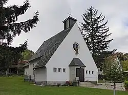 Die in rund 270 Meter Höhe über dem Meeresspiegel gelegene Kirche steht an der Schloßstraße, an der Ecke zur Straße Am Großen Garten. Das Gotteshaus wurde nach Plänen des Architekten Wilhelm Ulrich aus Halle (Saale) erbaut. Die Benedikt-Statue vor dem Oculus über dem Eingangsportal wurde 2015 aufgestellt.