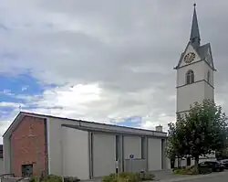 Das Langhaus der Saalkirche wurde 1962 in Form einer Hallenkirche gebaut. Der 1540 gebaute Kirchturm steht an der Nord-Ost-Seite des Langhauses. Er wurde später mit einem Geschoss aufgestockt, das den Glockenstuhl beherbergt, in dem vier Kirchenglocken hängen.[6]