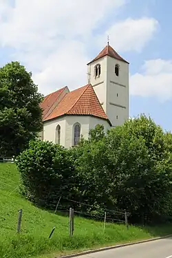 Die spätgotische Saalkirche wurde unter Verwendung von Teilen des Vorgängerbaus aus dem 9. Jahrhundert um 1500 erbaut. Sie besteht aus einem Langhaus, einem eingezogenen Chor mit Fünfachtelschluss im Osten und einem Chorflankenturm an der Nordwand des Chors, der mit einem Pyramidendach bedeckt ist. Der Innenraum des Langhauses ist mit einer Kassettendecke überspannt, die Dienste des Gewölbes im Chors ruhen auf Konsolen. Der neugotische Hochaltar wurde 1994 aufgestellt, er stammt aus der Kirche St. Dionysius in Oberfahlheim.
