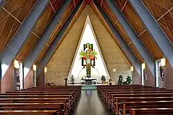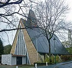 Die von Josef Fehlig entworfene Kirche befindet sich in rund 302 Meter Höhe über dem Meeresspiegel, sie verfügt über einen kreuzbekrönten Dachreiter. Die künstlerische Ausstattung gestaltete Wilhelm Keudel (1913–1974) aus Salzgitter. Das Relief vor dem Haupteingang stellt die zwölf Tore des himmlischen Jerusalems dar, die Darstellung an der Rückwand hinter dem Altar den Gnadenstuhl. Der Kreuzweg ist ein Werk des Bildhauers Josef Hauke. Die Orgel wurde 1968 erbaut und 1975 erweitert.