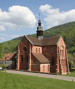Es handelt sich um eine dreischiffige kreuzförmige Pfeilerbasilika mit Querschiff. Der Grundriss mit Rechteckchor und zweimal zwei Nebenkapellen an der Ostseite des Querhauses ist typisch für romanische wie gotische Zisterzienserkirchen.[4] Der Bau besteht aus rotem Sandstein, der in der Umgebung gebrochen wurde.