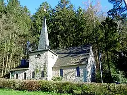Der Kapellenbau ist eine einschiffige, rechteckige, mit Bruchsteinen erbaute Hallenkirche mit einem steilen Satteldach. Aus Platzgründen wurde der zweiachsige quadratische Kirchturm mittig der sechsachsigen vorderen Längsseite leicht vorstehend eingebaut, in dessen Erdgeschoss sich die Sakristei befindet. In dem der Glocke vorbehaltenen Obergeschoss sind an den drei sichtbaren Wandseiten halbkreisförmige Schallluken eingelassen. Der Turm ist bedeckt von einem spitzen, mit Schieferplatten bekleideten Turmhelm.