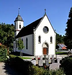 Die 1883 anstelle des abgebrochenen Vorgängerbaus errichtete Saalkirche besteht aus einem Langhaus, das mit einem Satteldach bedeckt ist, einem eingezogenen, halbrund geschlossenen Chor im Osten, an den der dreigeschossige Kirchturm angebaut ist.