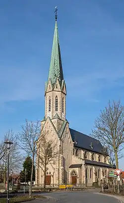 Eine dem heiligen Blasius von Sebaste geweihte Kirche, die dem Archidiakonat des Domkantors des Paderborner Doms unterstand, ist erstmals 1337 belegt.[1] Die heutige Kirche wurde von 1898 bis 1901 in neugotischen Formen nach Plänen von Lambert von Fisenne errichtet. Die neunjochige in einen Polygonalchor schließende Basilika besitzt im Westen einen aufwändig gestalteten Turmbau, der über mächtigen Giebeln in ein schlankes, von einem Steilhelm bekröntes Oktogongeschoss übergeht.
