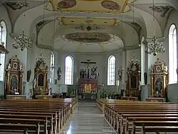 Der Innenraum des Langhauses ist mit einer Muldengewölbe auf Pilastern überspannt, der des Chors mit einer Spiegelgewölbe über Hohlkehlen. Die Fresken, im Chor mit dem Agnus Dei, im Langhaus mit der Speisung der 5000, hat 1796/97 Andreas Brugger eingefügt. Die Orgel wurde 1879 von der G. F. Steinmeyer & Co. gebaut.