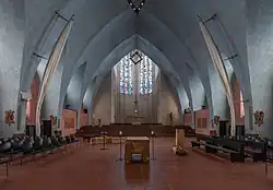 Nach der Beseitigung der größten Schäden 1948 wurde die Inneneinrichtung der Kirche in den folgenden Jahrzehnten mehrfach verändert. Die Renovierung 1987 unter Pfarrer Richard Weiler stellte den bedeutenden expressionistischen Innenraum weitgehend wieder her.[5] Bei der Umgestaltung der Kirche zur Jugendkirche wurden die Bänke durch eine mobile Bestuhlung ersetzt. Außerdem wurde ein zweiter Altar in der Mitte der Kirche errichtet, um den die Stühle bei Jugendgottesdiensten kreisförmig aufgestellt werden. Ein segelförmiger Raumteiler trennt dann den Gottesdienstraum vom vorderen Teil der Kirche mit dem Hochaltar.