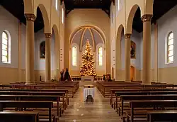 Der Altar aus Travertin von Bruno Knittel ist schlicht gehalten und ruht auf vier massiven Eckbeinen. Die Tabernakelstele und der Ambo sind aus Bronze gefertigt. Über dem Altar hängt ein Bronzekreuz. Alle diese Stücke stammen von Bruno Knittel. Der Zyklus der farbigen Glasfenster stammt vom Düsseldorfer Künstler Jochem Poensgen.[8] In der Turmhalle befindet sich eine Marienkapelle mit Gedenktafeln für die Gefallenen und Vermissten der Weltkriege sowie ein barockes Bildnis Mariä mit Kind von 1700/1750.