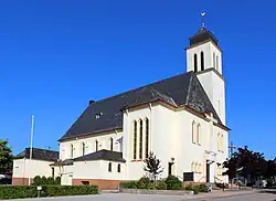 Bei dem Kirchengebäude handelt es sich um eine einschiffige Saalkirche, das sich in ein Langhaus und einen Chor gliedert. Das Langhaus verfügt im Inneren über keine weitere Untergliederung durch Stützmauern oder Säulen. Lediglich zwei schmale Gänge, die den Seitenwänden des Langhauses angefügt und durch Pfeiler vom Langhaus abgetrennt sind, deuten Seitenschiffe an. Auch die Anbauten an der Südfassade des Kirchenschiffes sorgen am Außenbau für eine gewisse Gliederung. Das Kirchenschiff besitzt in der Mitte ein tonnenartiges Gewölbe, das zu beiden in einen flachen Deckenteil übergeht, der über weitere Abstufungen und einen schrägen Deckenteil in die Seitenwände übergeht. Buntglasfenster gliedern den oberen Bereich der Seitenwände des Langhauses. Im Bereich des Hauptportals nimmt eine Empore die gesamte Breite des Kirchenschiffes ein. Der Chor wird von einer Tonnendecke ähnlich der im Langhaus überwölbt, die hier aber direkt in die Seitenwände übergeht. Abgeschlossen wird der Chor durch eine Apsis. Der Kirchturm mit seinem pyramidenförmigen Helm ist nahe der nordöstlichen Gebäudeecke an der Seite platziert.[2]