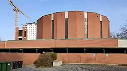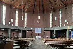 Das zylinderförmige Kirchengebäude aus rotbraunem Sichtziegelmauerwerk mit einer Ringbebauung aus überdachtem Wandelgang wurde 1970 vom Architekturbüro Oberberger erbaut. Der Baukomplex umfasst auch Pfarrzentrum, den Pfarrhof, das Pfarrheim, Jugendräume und Kindergarten. Die Kirche hat im Inneren des sechzehneckigen Kirchenraums mit 30 Metern Durchmesser ein Zeltdach aus Holzpaneelen mit 16 Feldern. Die Marienkapelle enthält eine katalanisch-romanische Madonna mit dem Kind aus dem 13. Jh. Den Keramik-Kreuzweg schuf Otto Schafarschik aus München. Der Entwurf der 14 Fenster stammt von Josef Oberberger aus München. Der Glockenturm mit quadratischem Grundriss ist 21 Meter hoch.