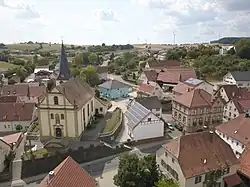 Die 1772/77 erbaute spätbarocke Saalkirche besteht aus einem Langhaus, einem eingezogenen, dreiseitig geschlossenen Chor im Westen und einem Chorflankenturm an seiner Südwand, der im Kern vom romanischen Vorgängerbau stammt. Sein oberstes Geschoss beherbergt die Turmuhr. In den Dachgauben seines achtseitigen Knickhelms sind die Klangarkaden untergebracht, hinter denen sich der Glockenstuhl verbirgt, in dem vier Kirchenglocken[1] hängen. In der Mitte der dreigeteilten Fassade im Osten befindet sich das Portal, über dessen Sprenggiebel in einer Nische die Statue des Burkard steht.