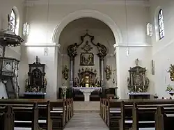 Ein Teil der Kirchenausstattung ist älter als das Bauwerk. Der Hochaltar stammt aus der zweiten Hälfte des 18. Jahrhunderts. Auf seinem Altarretabel ist die Heilige Familie dargestellt. Der rechte Seitenaltar enthält ein Relief der Ölberggruppe, geschaffen von Zacharias Juncker dem Älteren. Es stammt aus der Krypta des Würzburger Doms. Die Orgel mit 15 Registern, verteilt auf zwei Manualen und Pedal wurde 1933 als Opus 472 von Willibald Siemann erbaut. Dabei wurde das historische Gehäuse mit einem schmucklosen Anbau an der Rückseite erweitert, um die raumgreifenden Kegelladen unterzubringen.[1]