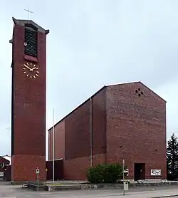 Die Kirche ist eine Mischung aus modernem Saalbau und altchristlicher Basilika mit flachem Satteldach.[1] Kirchenbau und freistehender Kirchturm sind mit roten Ziegeln verkleidet. Der Kirchturm steht an der nordwestlichen Ecke und trägt vier umseitige goldene Uhren.