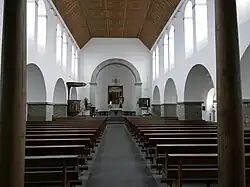 Der Innenraum, insbesondere der Altarraum, wurde von 1965 bis 1969 umgestaltet. Es wurde eine neue Decke eingezogen. Die Wände des Langhauses sind durch rundbogige Gruppenfenster zwischen flachen Vorlagen gegliedert. Die Seitenschiffe sind mit Lünettenfenstern ausgestattet.[1] 2022 wurde der Innenraum saniert.