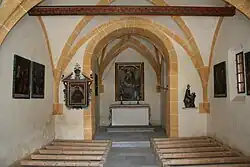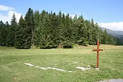 Grabungen im Jahr 1962 zeigten, dass auf der anderen Strassenseite – markiert durch ein Kreuz und Steinplatten – zwei frühmittelalterliche kleine Apsidenkirchen standen. Sie gehen ins 6. Jahrhundert zurück und bestanden zusammen mit einem dicht belegten Gräberfeld bis ins 12. Jahrhundert. Warum die Anlage aufgegeben wurde, ist nicht bekannt. Die gefundenen Mauerreste wurden wieder zugeschüttet.