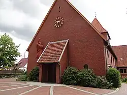 Ab 1950 wurde der Neubau einer Kirche geplant; 1952 fand die Einweihung der von Walter Kremer (Duisburg) entworfenen Kirche statt. Die einfache verklinkerte Kirche mit einem Satteldach fasst 300 Plätze. Im nur 23 Meter hohen quadratischen Turm mit einem Zeltdach hängen drei Glocken. Die weiteren eingeschossigen Bauten beherbergen Gemeinderäume, Kindergarten, Schwesternkonvent und Pfarrhaus. Alle Bauten entstanden unter aktiver Mithilfe der Gemeindemitglieder und durch Spenden.