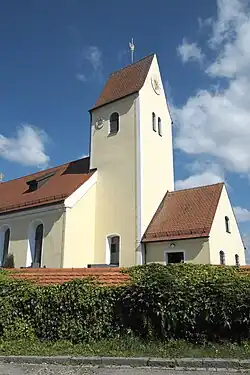 Die neobarocke Saalkirche wurde 1910 nach Plänen von Joseph Elsner junior im Westen des um 1300 gebauten Chorturms des gotischen Vorgängerbauwerks errichtet. Im obersten Geschoss des Turms steht der Glockenstuhl mit drei Glocken, gegossen 1950 von Karl Czudnochowsky aus Erding, die auf die Schlagtöne fis‘ – a‘ – h‘ erklingen.[1] Östlich ist die Sakristei angebaut.