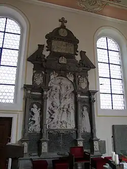 In der Kirche befinden sich mehrere Epitaphe. Das größte, für die Familie Schad, befindet sich an der Nordseite des Chores und nimmt den Raum zwischen den Fenstern ein. Das steinerne Epitaph im Stil der späten Renaissance ist gut ausgearbeitet und hat eine enorme Größe. Geschaffen wurde es von Esaias Gruber von Lindau, dessen Signatur GAE sich am Kreuz des zentralen Reliefs befindet. Das Relief zeigt Bernhard Schad in voller Rüstung, seine Gemahlin Veronika und die Töchter Euphrosine II. und Doothea in zeitgenössischer Kleidung. Die Frauen tragen Rosenkränze; alle haben die Hände zum Gebet gefaltet. Unter der Personengruppe befinden sich ein liegender Löwe, ein Rüstungshelm und ein Lamm. Über ihnen ist eine Kreuzigungsszene auf von Putten besetzten Wolken zu sehen. Ein Engel fängt das Blut Christi mit einem Kelch auf. Ein weiterer Kelch steht links auf einer Konsole, um das Blut aus seiner Handwunde aufzufangen. Flankiert wird das obere Kreuzstück von Sonne und Mond. Am oberen Rand befinden sich zwei Wappen.