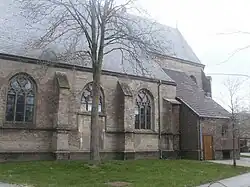 Die ehemals dem hl. Lambertus geweihte Kirche wurde erstmals 1298 urkundlich erwähnt. Die dreischiffige Pseudobasilika von drei Jochen entstand in mehreren Bauabschnitten. Der Chor mit 3/8-Schluss ist einjochig. In die Kirche wurden Kreuzrippengewölbe eingezogen. Die Untergeschosse des vorgesetzten dreigeschossigen Westturms aus Tuffstein stammen vom 12. Jahrhundert. Die Aufstockung aus Backstein ist spätgotisch. An der Westseite des Turmes wurde 1857 eine Verstärkung in Backstein angefügt. Der Sturz des Portals im nördlichen Seitenschiff ist mit 1514 bezeichnet.[1]