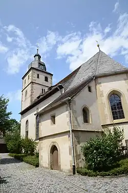 An der südlichen Außenwand des Langhauses befindet sich der Grabstein der Juliane von Steinau geb. Zobelin von Giebelstadt, gestorben 1675.