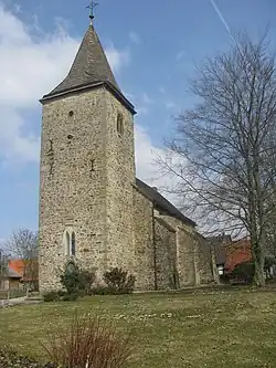 Eine erste, noch dem heiligen Kilian geweihte Holzkirche wurde zwischen 770 und 790 errichtet. Ihre Gründung wurde bei Renovierungsarbeiten 1964/65 unter dem Fußboden der jetzigen romanischen, aus Bruchsteinen gebauten Kirche gefunden. Die Saalkirche aus dem ausgehenden 12. Jahrhundert besteht aus dem quadratischen Kirchturm im Westen, einem Langhaus mit zwei Jochen, einem eingezogenen Chor mit einem Joch und einer niedrigen halbrunden Apsis. Die Strebepfeiler am Langhaus wurden nachträglich angebaut. Der romanische Turm wurde nach einem teilweisen Einsturz 1548 wieder aufgebaut, wie in einer Inschrift angegeben. Die dem Langhaus zugewandte Seite zeigt noch die Biforien des ursprünglichen Baus, die als Klangarkaden dienten. Später erhielt er einen schiefergedeckten, ins Achteck überführten Helm. Im Glockenstuhl des Turms befinden sich vier Kirchenglocken, die 1968 gegossen wurden und folgende Parameter aufweisen: