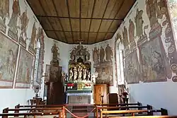 Der mit einem Flachdach überspannte Innenraum ist mit Fresken aus dem 16. Jahrhundert geschmückt. Zur Kirchenausstattung gehört ein um 1510 geschnitzter Hochaltar, der aus dem Umkreis von Niklaus Weckmann stammt.