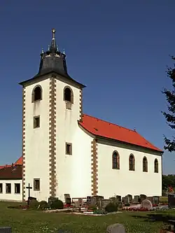 Die 1717 bis 1719 erbaute barocke Kirche hat einen achteckigen Kirchturm, der mit acht Gauben geschmückt ist. Der Barockaltar und zwei Seitenaltäre stammen teilweise noch aus dem 17. Jahrhundert, ein Kruzifix sogar aus der ersten Hälfte des 16. Jahrhunderts. Die Kanzel ist von 1748, die Orgel wurde gegen Ende des 17. Jahrhunderts gebaut.[6] Sie hat eine Sonnenuhr mit Rokokoverzierung. Neben der Kirche befindet sich eine Lourdesgrotte.
