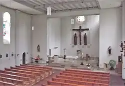 Altar, Taufbecken, Ambo und eine Kreuzigungsgruppe mit überlebensgroßen Figuren aus afrikanischem Edelholz wurden 1954 von dem Bildhauer Ernst Brauner geschaffen.[1]