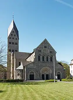 Die monumentale neuromanische Baugruppe wurde von 1912 bis 1913 nach einem Entwurf von Johann Franz Klomp errichtet. Sie besteht aus einer von Nordost nach Südwest ausgerichteten Querhausbasilika, dem beherrschenden Turm und dem baulich im Südosten angeschlossenen Pfarrhaus. Die Gebäude wurden im Zweiten Weltkrieg beschädigt, die Schäden wurden bis 1952 beseitigt.