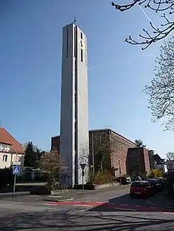 Das Kirchengebäude wurde von Johannes Reuter, Kassel, entworfen und 1963/64 errichtet. Es besteht aus einem Stahlbetonskelett mit Backsteinausfachung. Außen ist es mit Sandstein verkleidet. Das Satteldach ist nur schwach geneigt. Nach außen präsentiert sich das Gebäude als solitärer Kubus, der von stark reliefierten Betonbändern unterhalb des Dachansatzes akzentuiert wird. Diese gewähren zugleich den Lichteinlass über Farbfensterstreifen. Der Kirchturm aus Sichtbeton steht abgerückt, wie ein „Campanile“, und wurde erst einige Jahre später hinzugefügt.