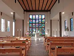 Das Ewige Licht ist in die Tabernakelstele integriert. Zur Ausstattung gehören ferner eine Marienstatue, vor der Opferkerzen aufgestellt werden können, ein Taufbecken und 14 Kreuzwegstationen.
