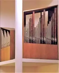 - Spielhilfen: 2 freie Kombinationen, 1 freie Pedalkombination, Tutti, Crescendowalze, Walze ab, Zungeneinzelabsteller