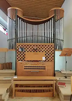 Das Schleifladen-Instrument mit rein mechanischen Trakturen hat 14 Register auf zwei Manualen und Pedal hat heute folgende Disposition: