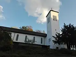 Die Kirche ist eine schlichte, weiß verputzte Saalkirche im Stil der Nachkriegszeit. Der noch vom Vorgängerbau stammende Turm ist den Bauten an der Südseite vorgesetzt und überragt den Kirchsaal mit dem südlich angesetzten Pfarrsaal, welchem sich westlich das Gemeindehaus anschließt.