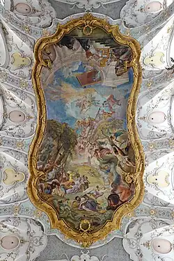 Das Westquerhaus besitzt eine bemalte Holzdecke, die Benedikt von Nursia zeigt.