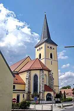 Durch den Brand vom 12. Juni 1848 ist diese Kirche zerstört worden. Unmittelbar danach wurde mit dem Wiederaufbau im neugotischen Stil begonnen. An Stelle des früheren Zwiebelturms wurde ein Flankenturm mit Spitzhelm errichtet. Eine Kirchturmuhr wurde von der Münchener Firma Mannhardt angeschafft. Am 11. Juli 1863 wurde die neu errichtete Kirche von dem Bischof Ignatius von Senestrey konsekriert. Wegen der gestiegenen Anzahl an Gläubigen wurde die Kirche unter Pfarrer Johann Baptist Roeseneder (1931–1948) 1934 durch zwei angebaute Seitenschiffe erweitert, sodass die Kirche heute eine dreischiffige Basilika mit einem fünfseitig geschlossenen Chor ist.