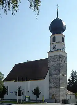 Die spätgotische Saalkirche wurde im 18. Jahrhundert barock umgestaltet. Sie besteht aus dem Langhaus zu drei Jochen, dem eingezogenen, dreiseitig geschlossenen Chor zu zwei Jochen im Nordosten, der Sakristei an der Südostwand des Chors und dem Kirchturm an der Südwestseite des Langhauses. Die unteren Geschosse des Kirchturms bestehen aus Quadermauerwerk und stammen aus dem Mittelalter. Er wurde mit zwei achteckigen, mit einer Zwiebelhaube bedeckten Geschossen aufgestockt, die den Glockenstuhl und die Turmuhr enthalten. Ein Vorzeichen befindet sich an der Südwestecke des Langhauses.