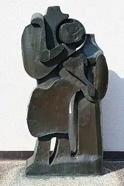 Aus einem Eichenholzstamm schuf Hugo Heule die Figur Prager Weihnacht. Sie zeigt eine grosse Person mit Riesenhänden, die ein kleines Kind umfängt und schützt.[11] Auf das Jahr 2001 schuf Stefan Gort die Kreuzplastik im Chorraum sowie die Kreuzwegstationen im Umgang der Kirche. Die schlichte Gestaltung in Rottannenholz nimmt die Architektur der Kirche auf. Der Kreuzweg besitzt eine Länge von 40 Meter und wurde aus 13 Meter langen Balken gearbeitet. Wörter helfen dem Betrachter, die einzelnen Stationen zu deuten. Das Kreuz im Chorraum zeigt als Besonderheit nicht Jesus als Gekreuzigten mit Wundmalen, sondern als Christus, der sich den Menschen zuwendet.[12]