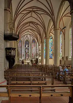 Sobald man in die spätgotische Hallenkirche geht, wird man von einer großen und lichten Halle erwartet. Die Größe entsteht dadurch, dass die beiden Seitenschiffe die gleiche Höhe haben wie das Mittelschiff und nur durch schlanke Rundpfeiler abgetrennt sind. Eine weitere Vergrößerung bewirkt der Turm, der in den Kirchenraum miteinbezogen ist. Er ist nach drei Seiten offen und steht auf zwei Dreiviertelpfeilern in der Westwand und auf zwei freistehenden massiven Rundpfeilern.