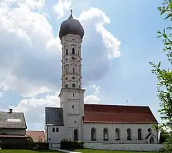 Die spätgotische Saalkirche wurde 1666 barock umgestaltet. Sie besteht aus dem 1937 auf sechs Joche nach Westen verlängerten Langhaus und dem Chorturm auf quadratischem Grundriss im Osten, an den die Sakristei angebaut ist. Der Turm wurde 1696 mit achteckigen Geschossen aufgestockt, in denen die Turmuhr und der Glockenstuhl mit drei Glocken untergebracht sind, und mit einer Zwiebelhaube bedeckt.