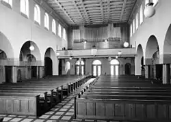 Das von Architekt Joseph Steiner realisierte Projekt bestand in einer Längskirche, die vom hinteren Eingang her den Weg freigab zum Altar im gegenüberliegenden Chor – eine sogenannte Wegkirche. Zu beiden Seiten zog sich im sonst noch kahlen Raum je ein Säulengang, das Mittelschiff und die beiden Seitenschiffe öffneten sich gegenseitig durch Arkaden. Dank der hellen Farbgebung genügten die unter der Decke angebrachten Rundbogenfenster als Lichtquelle. Einfache Kugellampen konnten zusätzlich entzündet werden. Über der Vorhalle beim Eingang erhob sich eine geräumige Orgelempore. Der Chor der Kirche öffnete sich auf der gegenüberliegenden Seite durch einen halbkreisförmigen Mauerbogen. Abgeschlossen wurde der Chor durch eine gerade Chorwand.[13]