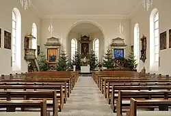 Farbige Akzente in den in weiß und ocker gehaltenen Kirchenraum bringen die Gemälde der Kreuzwegstationen. Die Ölgemälde auf Leinwand mit Stuckrahmen stammen wahrscheinlich von dem Maler Wendelin Moosbrugger.[25] Der nachbarocke Stationsweg ist wegen seiner Reihenfolge bemerkenswert, da er, von Ignaz Heinrich von Wessenberg beeinflusst, in ikonologischer Weise von der traditionellen Reihenfolge abweicht. Die Reihenfolge ist: Gethsemane, Judaskuss, Gefangennahme, Jesus vor Kaiphas, Verleugnung des Petrus, Verspottung, Dornenkrönung, Ecce homo, Händewaschung, Jesus begegnet seiner Mutter und Kreuzigung und Grablegung.