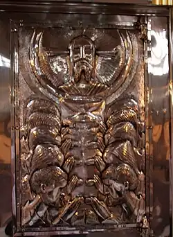 Alfred Claßen, Goldschmied aus Essen und Künstler aus der Folkwang-Schule, hat nach einem Entwurf von Joseph Rademacher aus Essen das Abendmahl in Silber getrieben und als Einfassung am Tabernakel angebracht. Dargestellt ist die Abendmahlszene in einer perspektivisch interessanten und sehr geschickten Lösung. Die Behandlung des Materials (Silber) beweist ein weit gediehenes technisches Können, der innige Ausdruck auf den übersichtlich gruppierten Gesichtern der Apostel zeugt von einer tief veranlagten Gestaltungskunst bei den Schöpfern des Werkes.