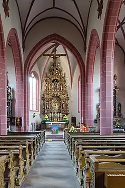 Der Hochaltar ist ein Werk aus dem Jahr 1617 von Georg Brenck, der zusammen mit dem Vorbild in der Andreaskirche Ochsenfurt zu den bedeutendsten Werken dieser Epoche zählt. Er besteht aus einem marmorierten, vielgliedrigen hohen Etagenbau aus Holz mit zahlreichen Skulpturen und Reliefs. Der nördliche Seitenaltar von 1620 wird ebenfalls Brenck zugeschrieben, der südliche stammt aus der Zeit um 1650.